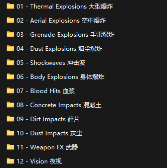包含383组特效合成4K视频素材,比如大型爆炸、空中爆炸、手雷爆炸、烟尘爆炸、冲击波、血浆、混凝土、碎片、灰尘、武器开枪、夜市特效等,包含透明通道,任何后期软件可以直接使用